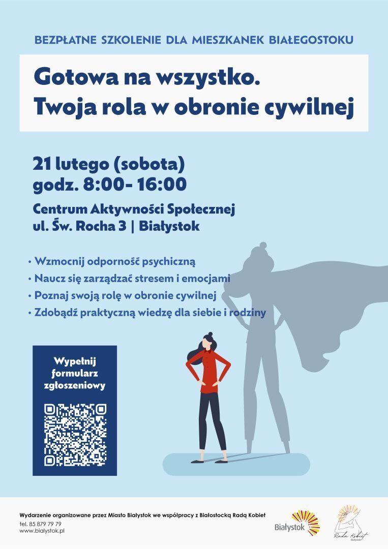 Mieszkanki Białegostoku mogą wziąć udział w bezpłatnym szkoleniu „Gotowa na wszystko. Twoja rola w obronie cywilnej”, które przygotuje do reagowania w sytuacjach kryzysowych, radzenia sobie ze stresem i wzmacniania odporności psychicznej.