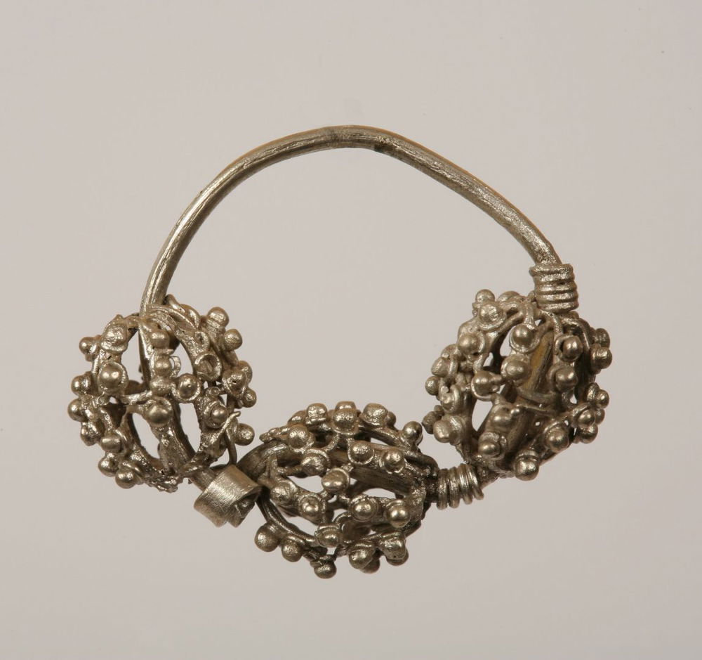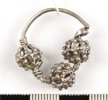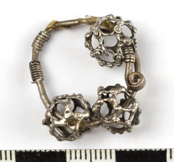 ZAUSZNICE, Daniłowo Małe, gm. Łapy, woj. podlaskie, wczesne średniowiecze, 2. poł., XI–XI/XII w., srebro, śr. kabłąka 2,4 cm, średnica paciorków 0,9-1 cm.