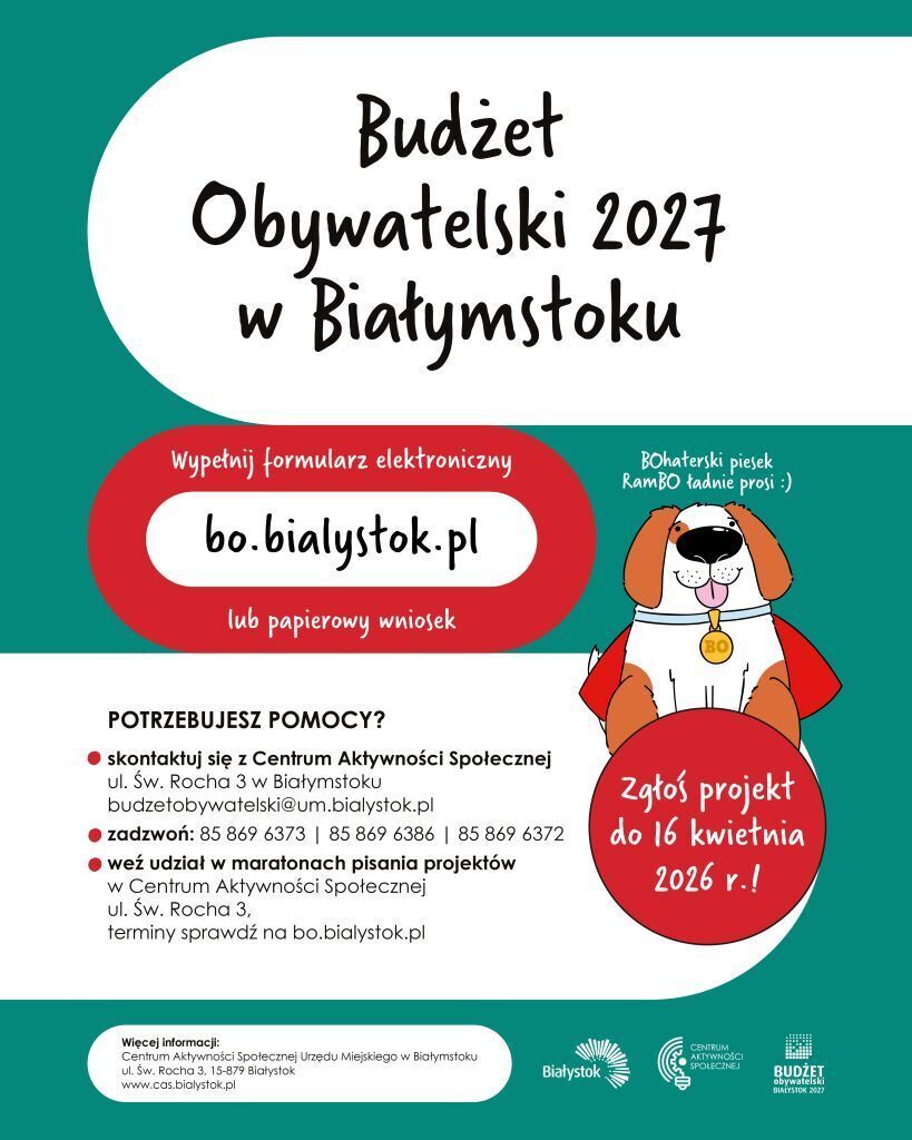 Startuje 14. edycja Budżetu Obywatelskiego w Białymstoku. Mieszkańcy mogą zgłaszać swoje pomysły od 16 marca do 16 kwietnia 2026 roku. Na realizację projektów w tym roku przeznaczono 15 mln zł. Wnioski można składać elektronicznie lub osobiście. Osoby potrzebujące wsparcia lub pomocy w wypełnieniu formularza zgłoszeniowego mogą skorzystać z maratonów pisania projektów.