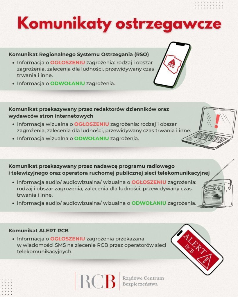 Rząd Rzeczypospolitej Polskiej opracował „Poradnik bezpieczeństwa”, z którego można dowiedzieć się o kwestiach ważnych w sytuacji rzeczywistego zagrożenia. Znajdują się tam informacje m. in. o sygnałach alarmowych i komunikatach ostrzegawczych wykorzystywanych przez służby w Polsce. Alarmy i komunikaty są ściśle określone i warto je znać, aby zapobiec dezinformacji.