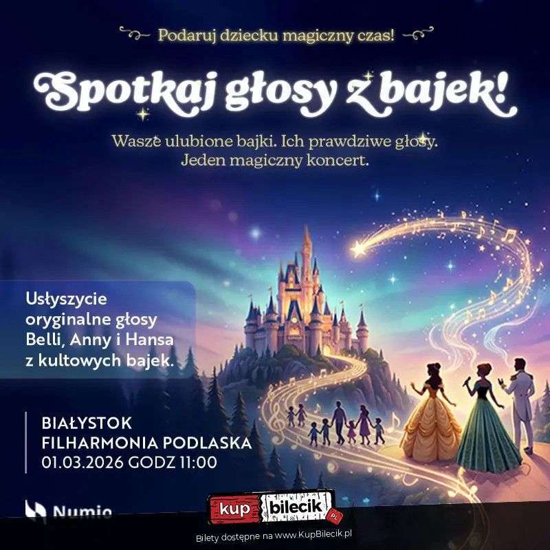 bilety: Spotkaj Głosy z Bajek! Podaruj swojemu dziecku coś naprawdę wyjątkowego. Spotkaj Głosy z Bajek artyści: Różni artyściSpotkaj Głosy z Bajek! Podaruj swojemu dziecku coś naprawdę wyjątkowego. Jeśli szukasz prezentu, który wywoła zachwyt, radość i prawdziwe emocje - to wydarzenie jest właśnie dla Ciebie. Spotkaj Głosy z Bajek! to jedyna taka okazja, aby Twoje dziecko mogło usłyszeć na żywo oryginalne głosy Anny, Hansa i Belli i wielu innych znanych i kochanych postaci ze świata kultowych bajek. Podczas wydarzenia Twoje dziecko nie tylko usłyszy na żywo ukochane głosy, ale będzie miało również wyjątkową okazję spotkać ich właścicieli, porozmawiać z nimi i przeżyć prawdziwie bajkowe spotkanie. To wydarzenie zostało stworzone z myślą o rodzicach i ich pociechach - w przystępnej cenie, dostępnej dla każdego, bez konieczności wydawania fortuny. To jedyna taka okazja żeby spotkać głosy, które na co dzień żyją w wyobraźni Twojego dziecka - i usłyszeć je na żywo, razem, w magicznej koncertowej atmosferze. Przeżyjecie ten czas razem. Bez pośpiechu, bez ekranów, za to z muzyką, magią i emocjami, które zostaną z Wami na długo. "Spotkaj głosy z bajek" to wspomnienie, które Twoje dziecko zapamięta na całe życie. Bilety do nabycia na: KupBilecik.pl |